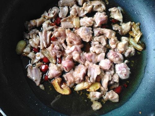 3. 炒制过程:锅中倒入适量的油,油热后放入腌制好的兔肉,快速翻炒至变色。然后加入青椒丝,继续翻炒。